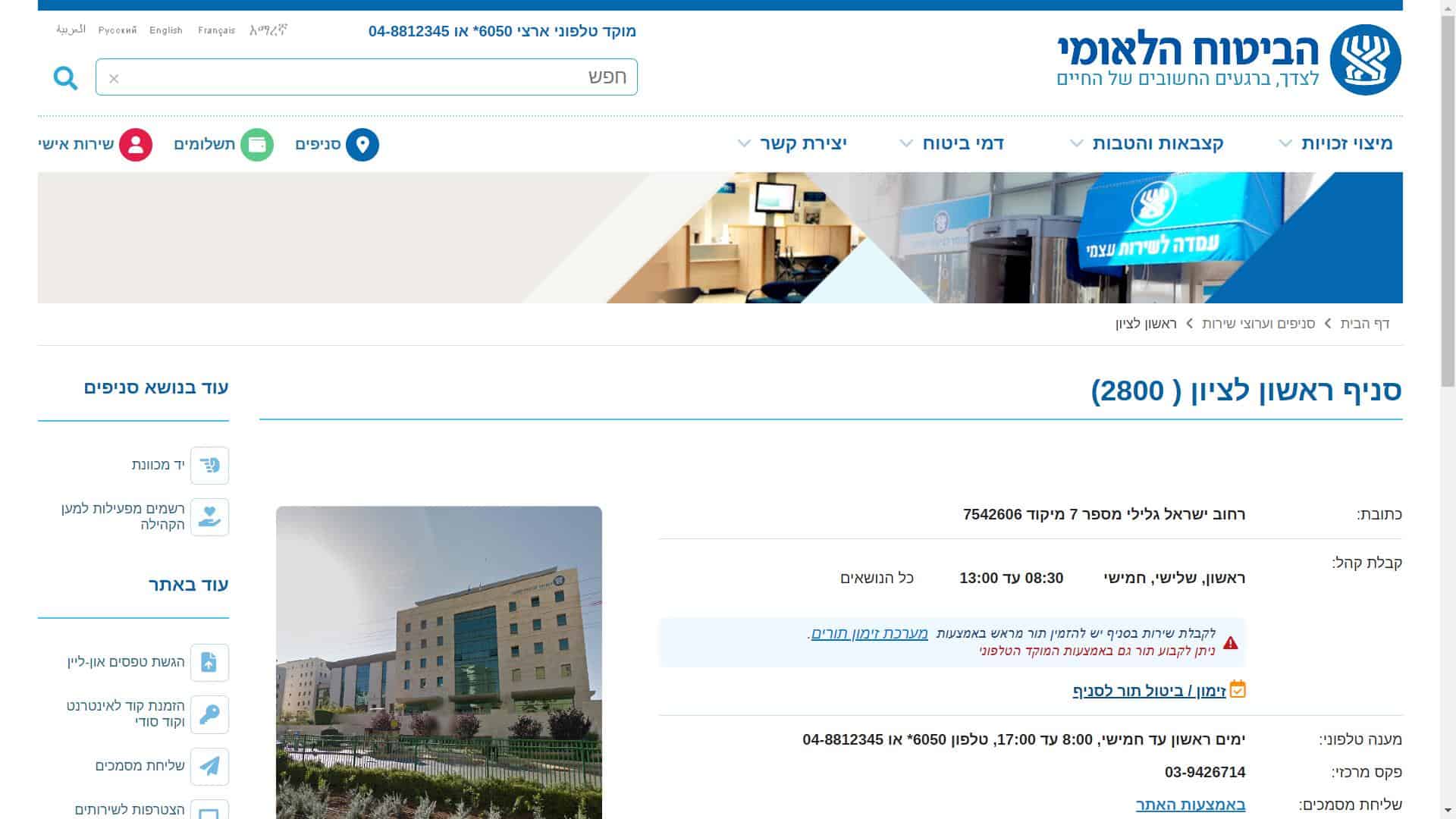במידה ואינכם מצליחים לבצע זימון תור לביטוח לאומי ראשון לציון דרך האינטרנט, אנחנו משתדלים לצרף גם פרטי יצירת קשר עם שירות הלקוחות של בית העסק כך שתוכלו לבקש עזרה טלפונית בקביעת התור.
