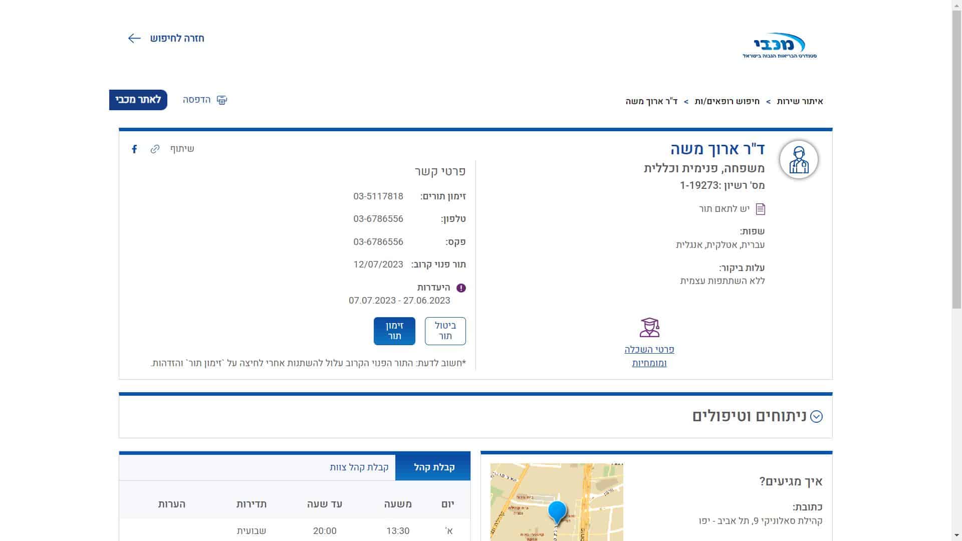 במידה ואינכם מצליחים לבצע זימון תור לד"ר ארוך דרך האינטרנט, אנחנו משתדלים לצרף גם פרטי יצירת קשר עם שירות הלקוחות של בית העסק כך שתוכלו לבקש עזרה טלפונית בקביעת התור.