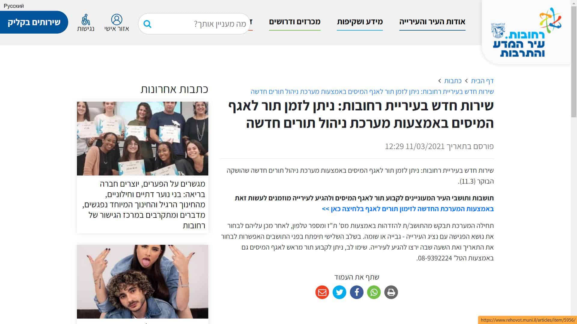 - האפשרות השנייה היא להשתמש באתר האינטרנט של העירייה. באתר ניתן למצוא מידע עדכני על זמינות תורים ולקבוע תור באופן מקוון. כדי לקבוע תור באתר, יש להירשם ולבחור את השירות הרצוי. יש לציין שבמקרים רבים, זמינות התורים באתר האינטרנט עדכנית יותר מאשר במוקד השירות.