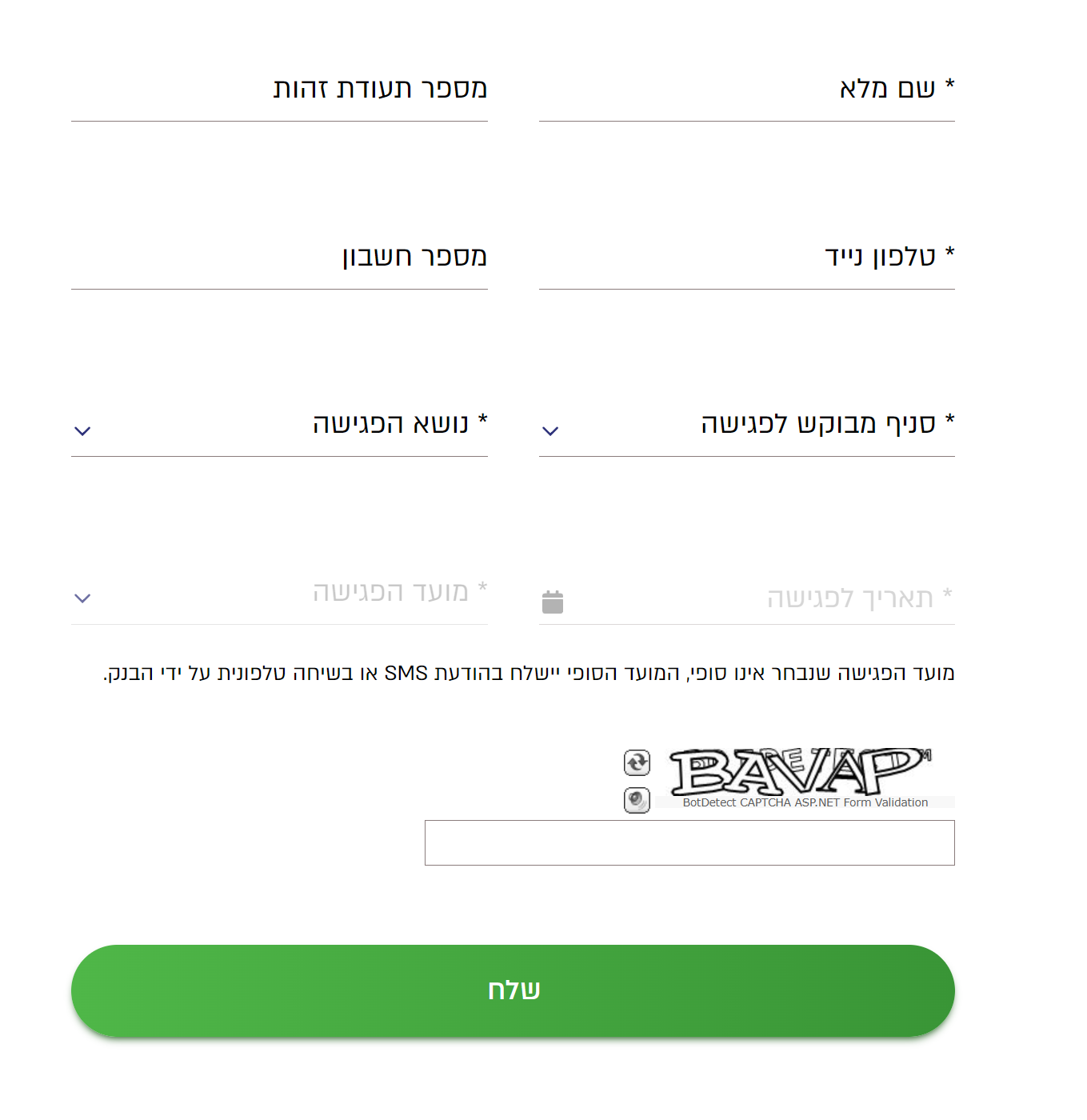 - לאחר שתמלאו את כל הפרטים האישיים ואת כל הפרטים על הפגישה, תצטרכו לבצע אימות ולאחר מכן ללחוץ על האפשרות ״שלח״. לאחר שתלחצו על האפשרות ״שלח״ יחזרו אליכם מהבנק תוך מספר שעות בנוגע לקביעת התור.
