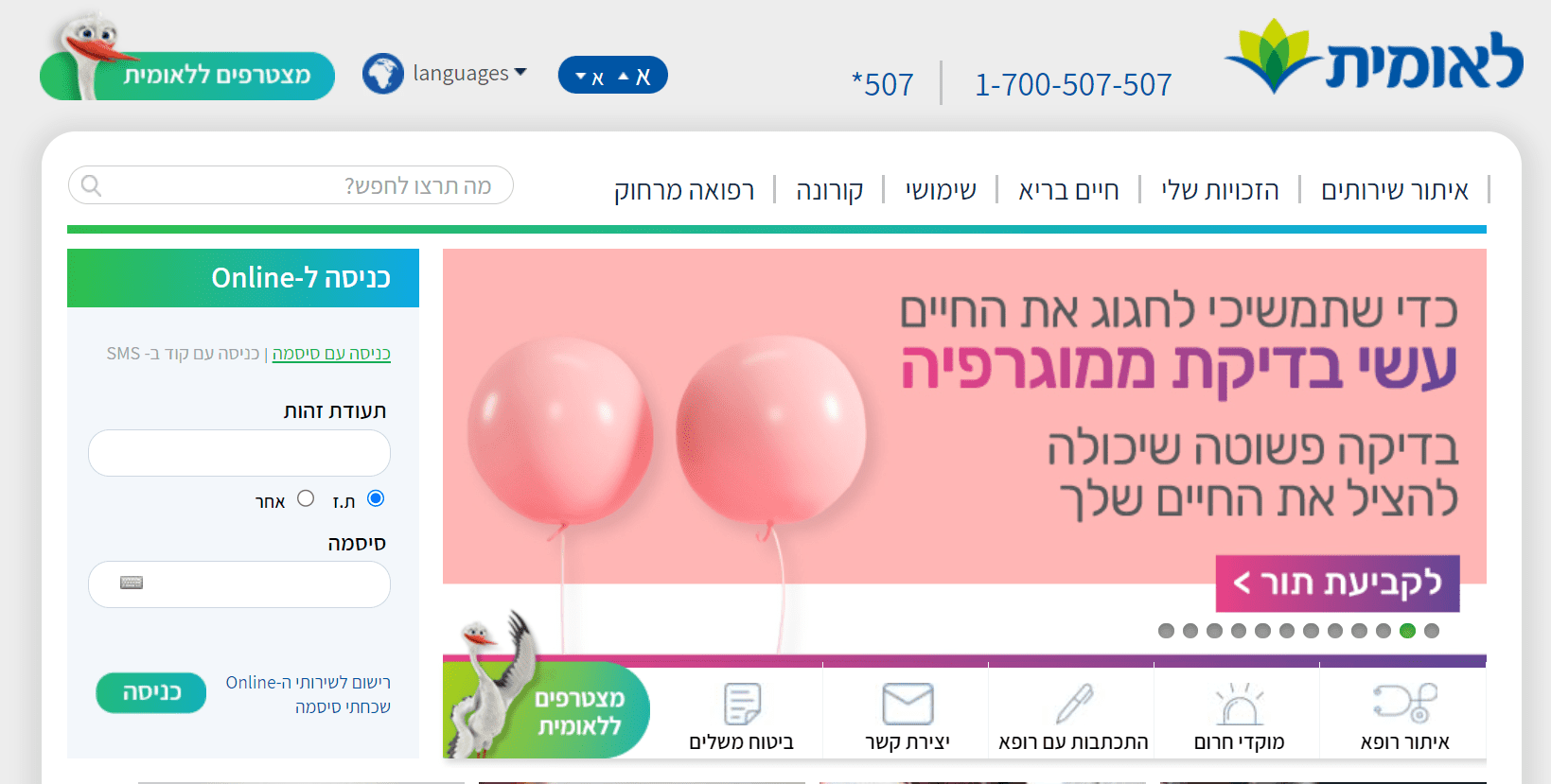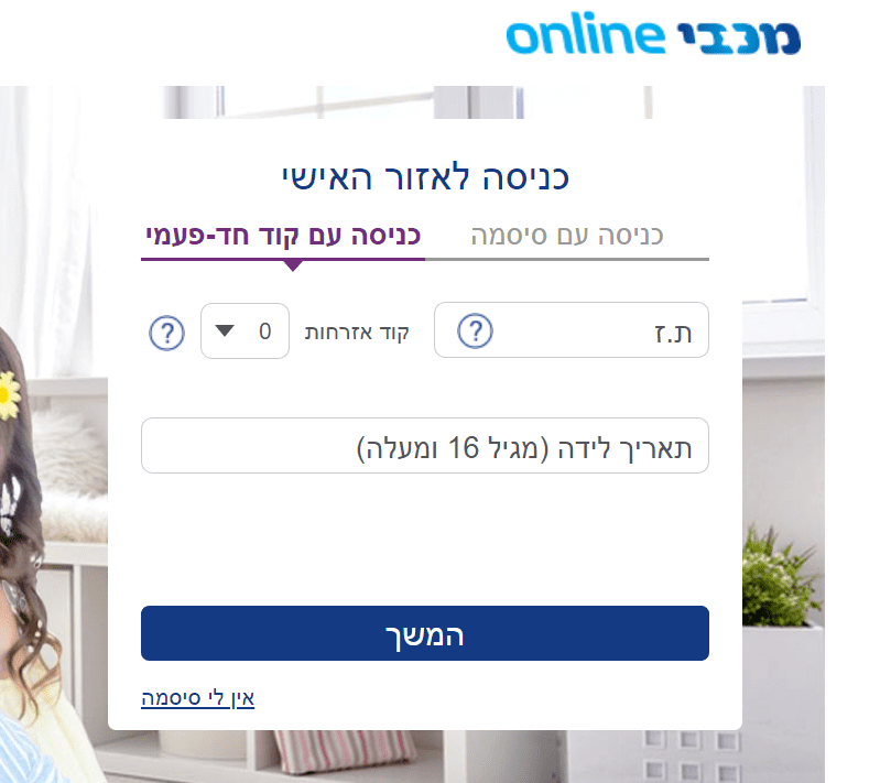 - אחרי שתכנסו לאתר האינטרנט של קופת חולים מאוחדת תצטרכו לבצע הזדהות על ידי מספר תעודת זהות וסיסמא או שנת לידה.