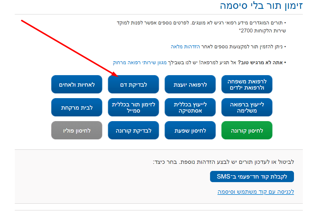 - לאחר שתבצעו הזדהות לאתר כללית תצטרכו לבחור באפשרות ״לבדיקת דם״.