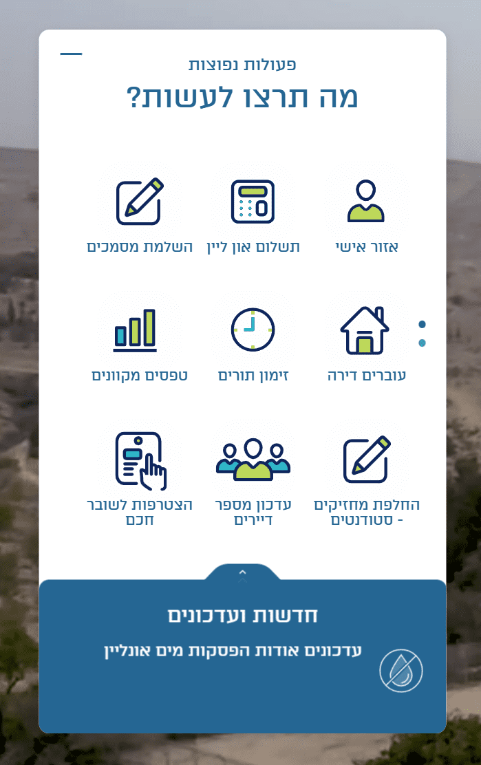 - לאחר מכן, עליכם לבחור בין השירותים המוצעים בסניף למשל, הסדר חוב, צריכה חריגה/חשש לנזילה, עדכון פרטי תושב ועוד.