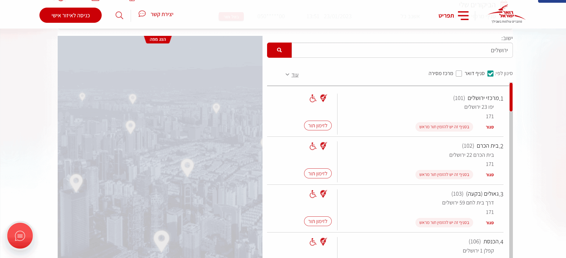- עכשיו יש לבחור את הסניף המבוקש וללחוץ על הכפתור "לזימון תור".